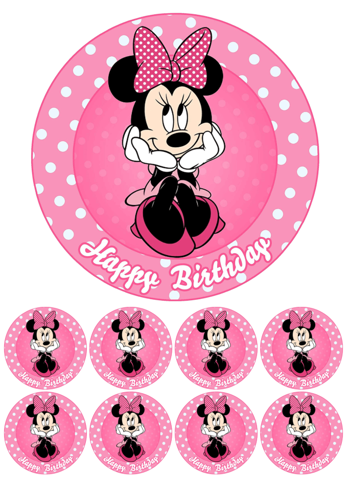Eetbare print - 17,5 cm rond + 8 rondjes 5 cm - Happy Birthday muis roze