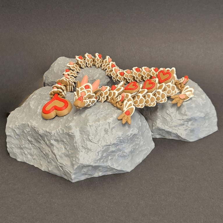 Deze schattige flexibele 3D-geprinte draak is geïnspireerd door heerlijke hartvormige koekjes. Met haar speelse details en sierlijke vormen lijkt ze rechtstreeks uit een sprookjesachtige bakkerij te komen! Haar warme tinten en fijne afwerking maken haar een onweerstaanbare toevoeging aan elke collectie.