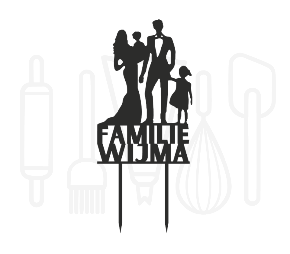 Afmeting taarttopper (exclusief prikkers): De taarttopper heeft een hoogte van 14 cm, de breedte is afhankelijk van de lengte van de achternaam.